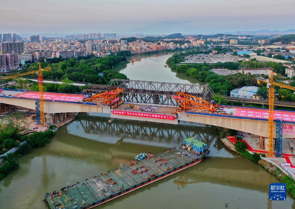 經(jīng)過(guò)中鐵三局施工人員連續(xù)6小時(shí)整體吊裝和焊接,廣州白云火車站流溪河特大橋重達(dá)1100噸的鋼箱梁主梁與鋼混連接段于4月27日凌晨順利合龍。流溪河特大橋?yàn)榫V高鐵聯(lián)絡(luò)線和廣湛高鐵聯(lián)絡(luò)線四線鐵路并行橋梁。