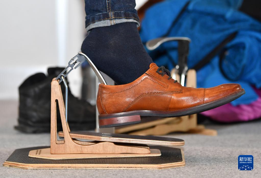 這是4月26日在瑞士日內瓦舉行的第48屆日內瓦國際發明展上拍攝的一款穿鞋器。