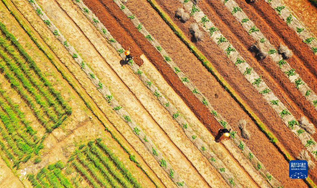 4月26日,在湖南省永州市新田縣驥村鎮(zhèn)黃栗山村,農(nóng)民在南瓜田里挖土準(zhǔn)備套種大豆(無人機照片)。