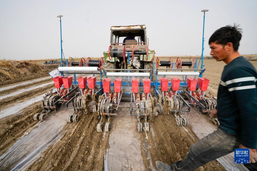 新疆尉犁縣巴西買里村,爾肯·熱衣木駕駛拖拉機在棉田鋪設地膜和播種(4月21日攝)。