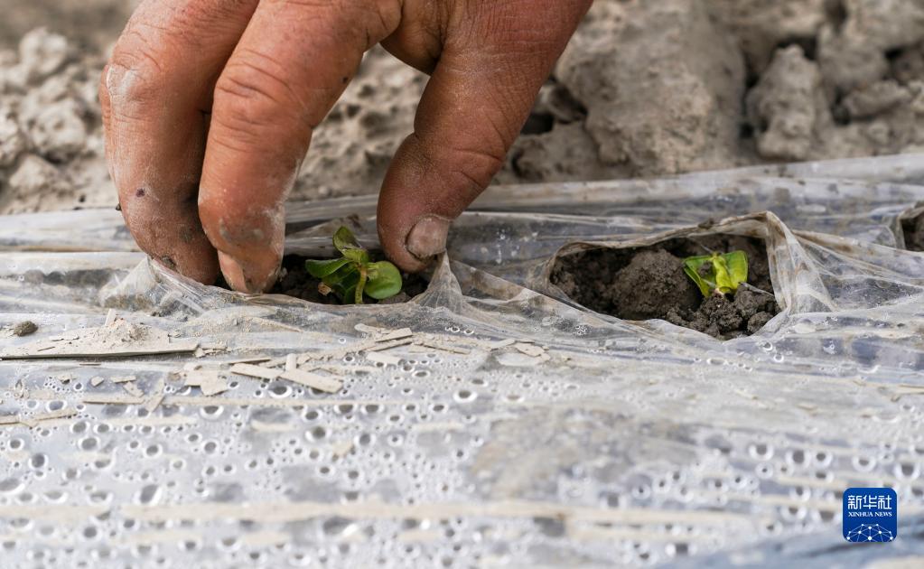 新疆尉犁縣巴西買里村,爾肯·熱衣木用手撥開地膜,讓棉花嫩芽鉆出(4月22日攝)。因為地勢變化等原因,即使松土設備駛過,仍有一些棉花嫩芽無法鉆出地膜。