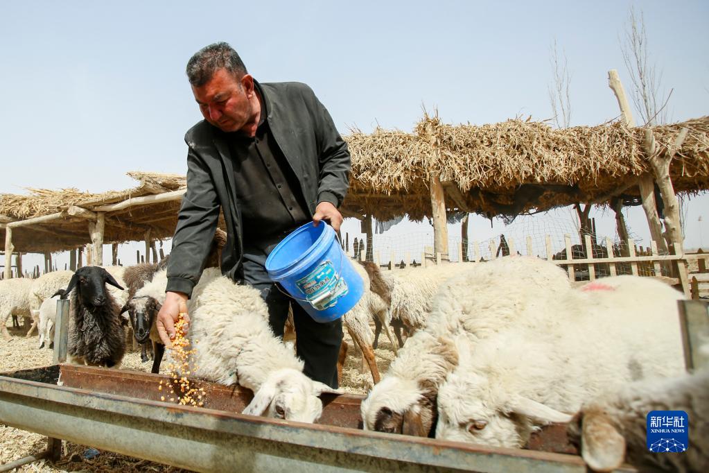新疆尉犁縣巴西買里村,爾肯·熱衣木給羊喂食(3月29日攝)。