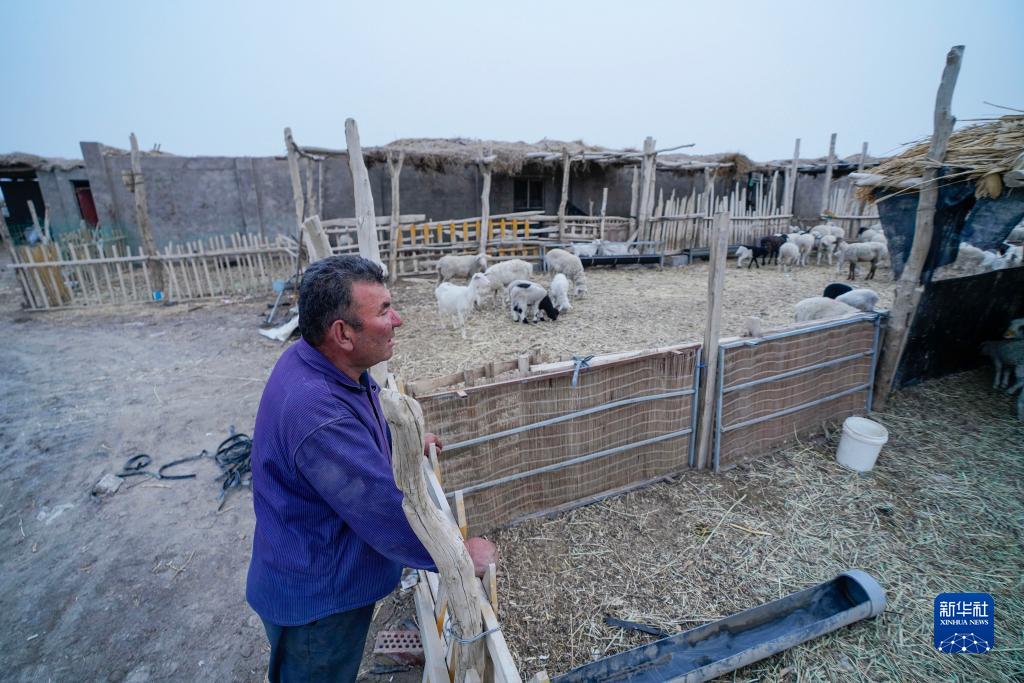 新疆尉犁縣巴西買里村,天色漸暗,忙完農活的爾肯·熱衣木查看自家的羊群(4月21日攝)。