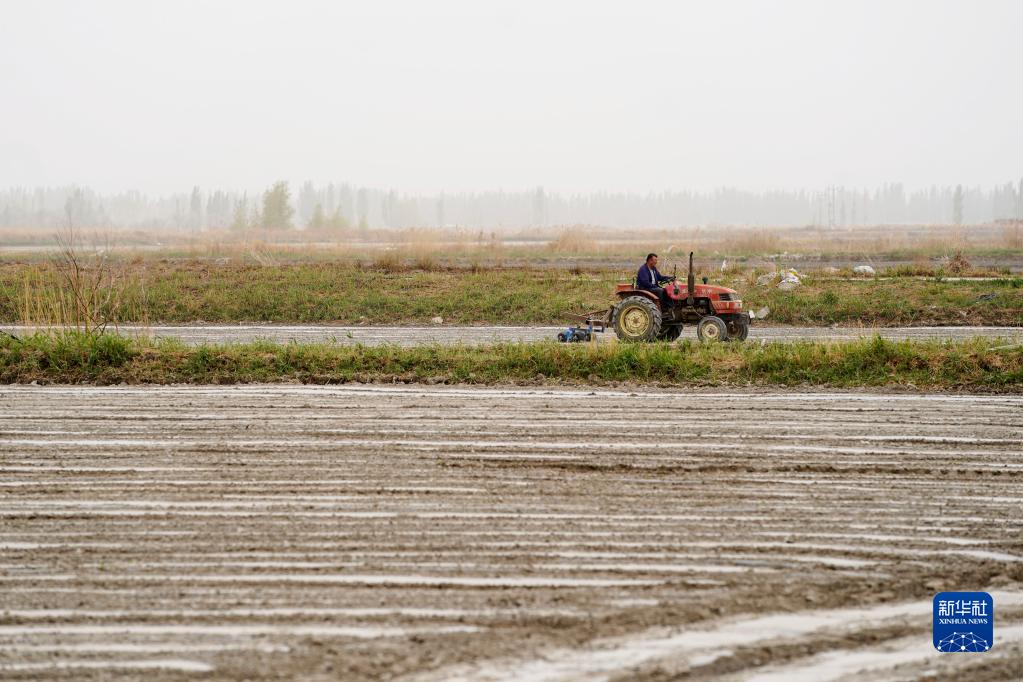 新疆尉犁縣巴西買里村,爾肯·熱衣木駕駛拖拉機在棉田里工作(4月22日攝)。拖拉機后面掛著松土設備,通過碾壓和震動,讓雨后板結的泥土松動,有助于棉花嫩芽順利鉆出地膜。