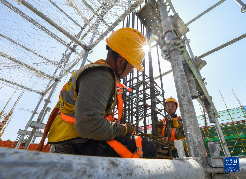 4月27日,在中建安裝集團有限公司位于四川遂寧市射洪市的廠房增產(chǎn)擴能項目建設現(xiàn)場,參建者參加柱鋼筋綁扎比賽。
