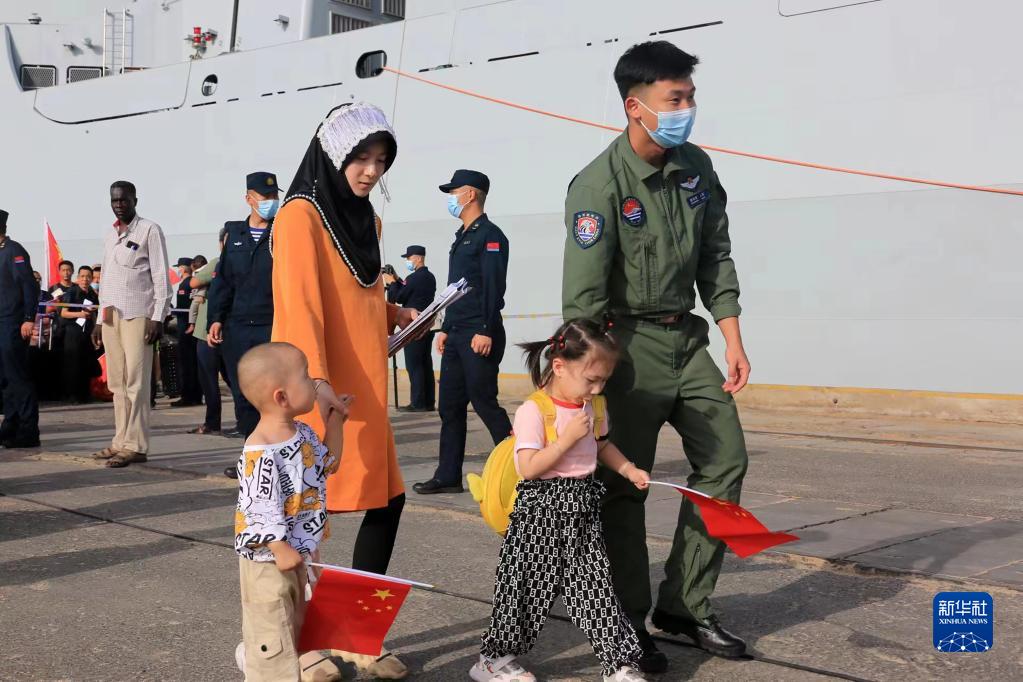 當地時間4月26日,中國海軍導彈驅逐艦南寧艦、綜合補給艦微山湖艦緊急駛赴蘇丹,執行撤離我在蘇丹人員任務。這是任務官兵在碼頭引導撤離人員登艦。