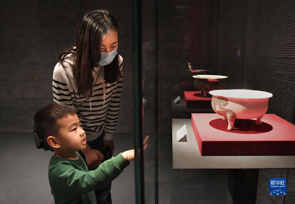 4月27日,參觀者在曹操高陵遺址博物館內觀看展品。