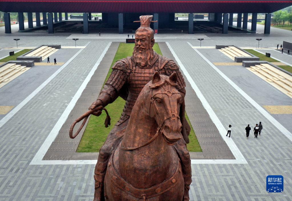 這是4月24日拍攝的曹操高陵遺址博物館的“魏武揮鞭”塑像(無人機照片)。