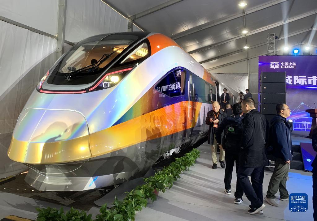 4月27日,與會者在參觀中車四方股份公司新發布的我國新型城際市域智能列車CINOVA2.0。