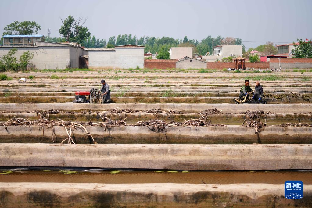 4月27日,在河北邢臺經(jīng)濟(jì)開發(fā)區(qū)九家鋪村清水藕基地,農(nóng)民在采挖藕苗。
