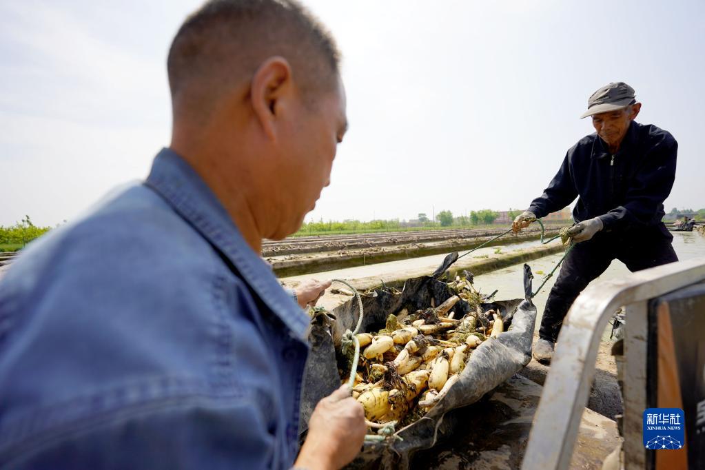 4月27日,在河北邢臺經濟開發區九家鋪村清水藕基地,農民在搬運藕苗。