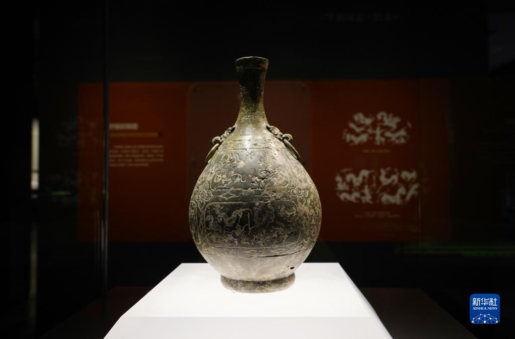 這是4月27日在羅家壩遺址博物館拍攝的狩獵紋銅壺。