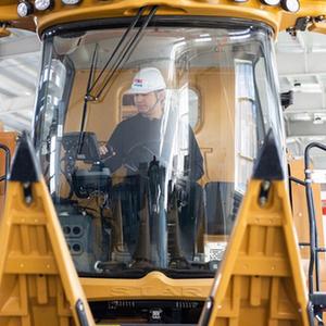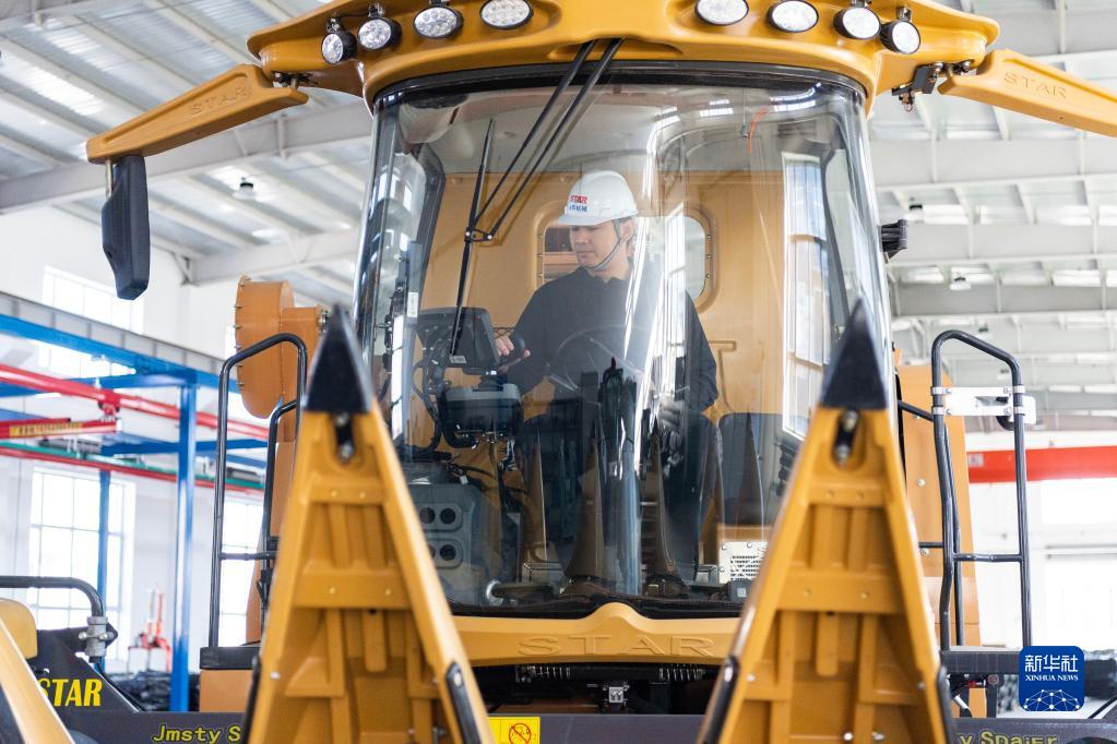 4月26日,宮照旭在公司生產車間內試駕其自主研發生產的全地形履帶式玉米收割機。
