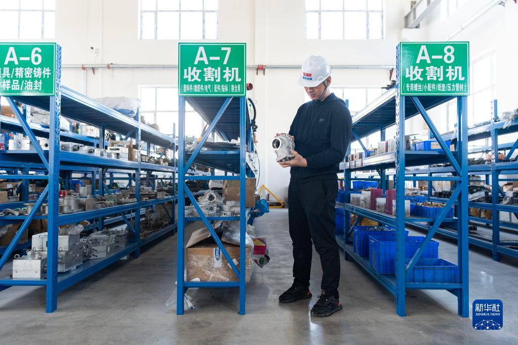 4月26日,宮照旭在公司生產車間內查看農機配件。