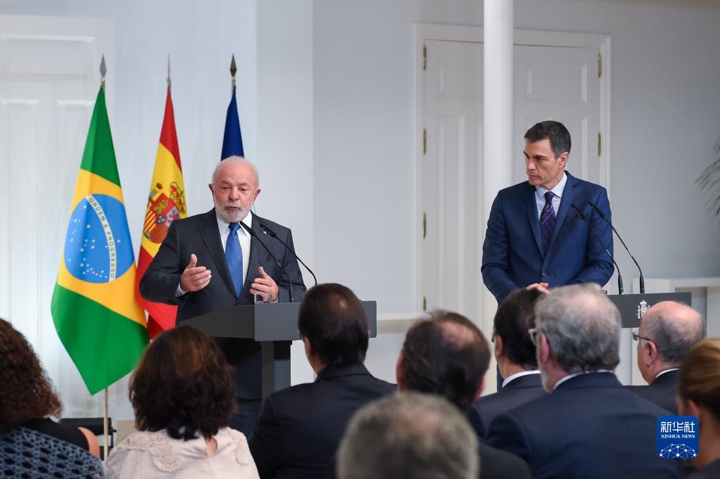4月26日,巴西總統(tǒng)盧拉(左)和西班牙首相桑切斯在馬德里舉行聯(lián)合記者會(huì)。