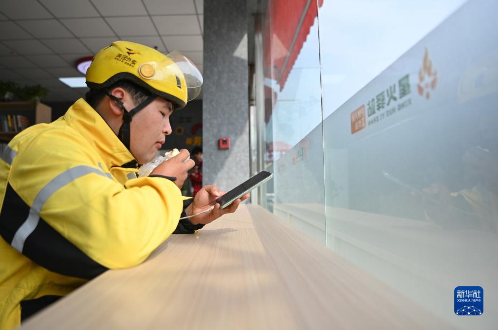 4月27日,外賣(mài)小哥在星火驛站吃飯休息。