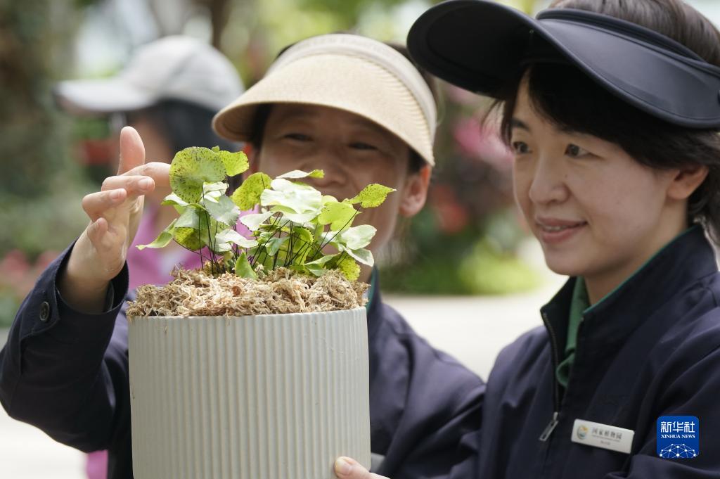 4月27日,國家植物園的植物專家在觀察荷葉鐵線蕨的生長情況。