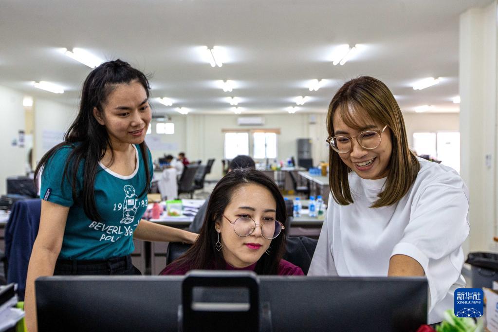 潘納洛(右)在泰國中泰鐵路一期工程項目部監理總站與同事討論工作(2月23日攝)。新華社記者 王騰 攝