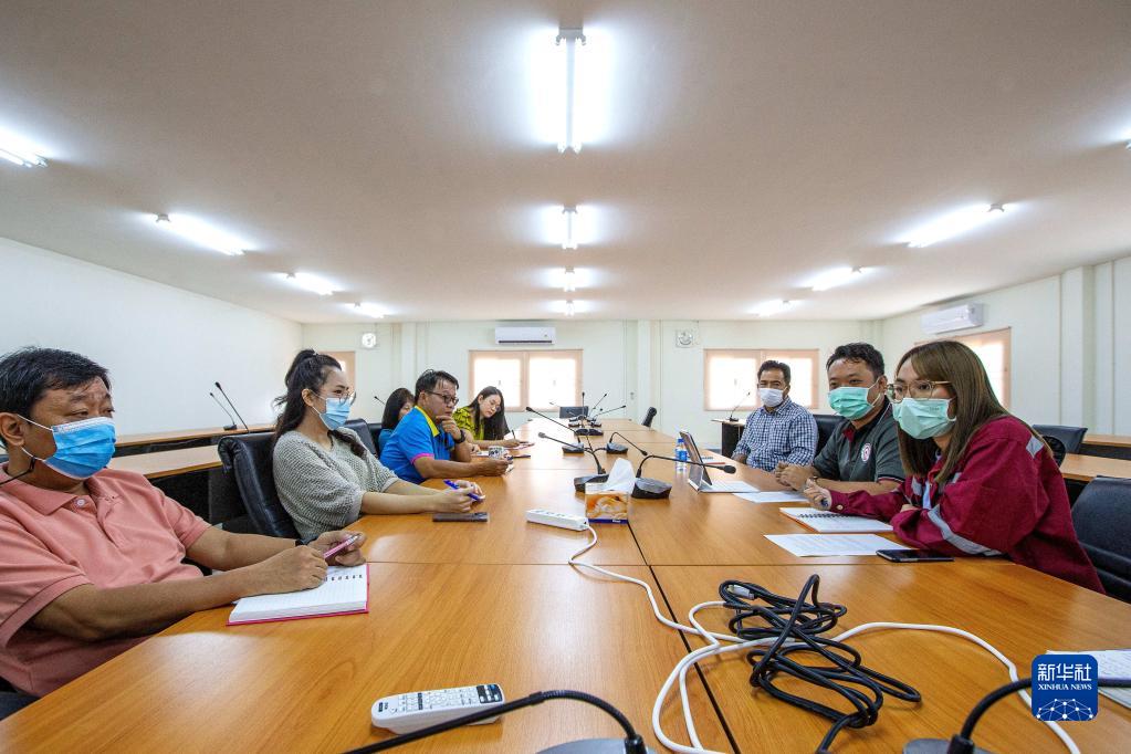 潘納洛(右一)在泰國中泰鐵路一期工程項目部監理總站和同事一起開會(2月24日攝)。新華社記者 王騰 攝