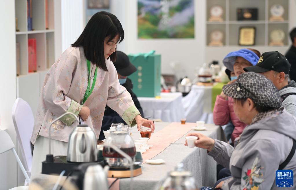 4月28日,來自福建柘榮縣的茶藝師(左一)為游客泡茶。