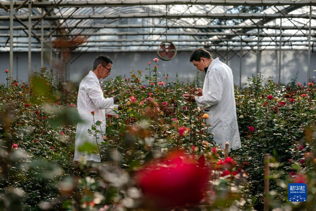 云南錦科花卉工程研究中心技術人員在篩選玫瑰推廣新品種(4月3日攝)。