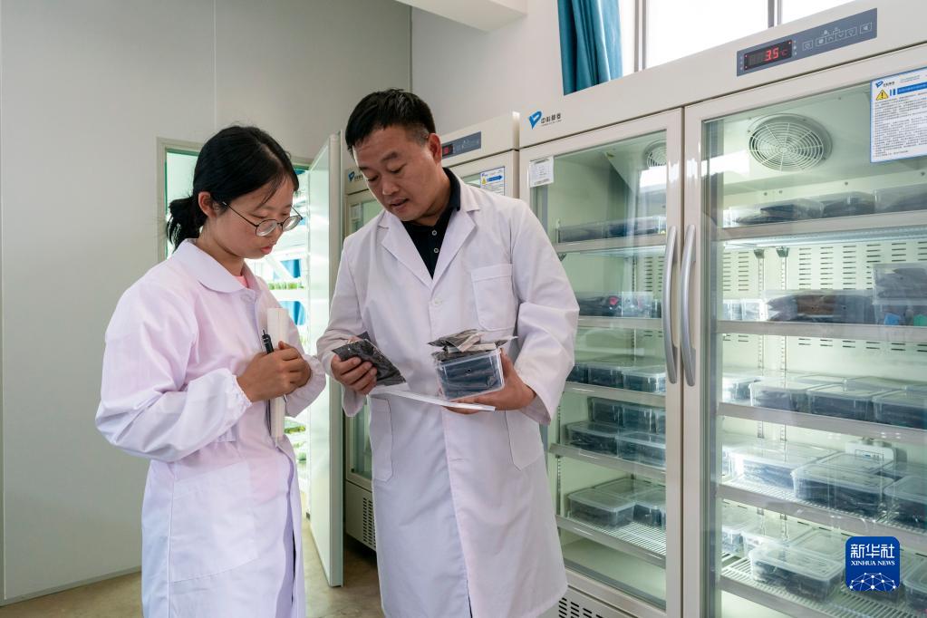 李淑斌(右)和團隊成員在實驗室內查看營養土包裹下的月季種子(4月20日攝)。
