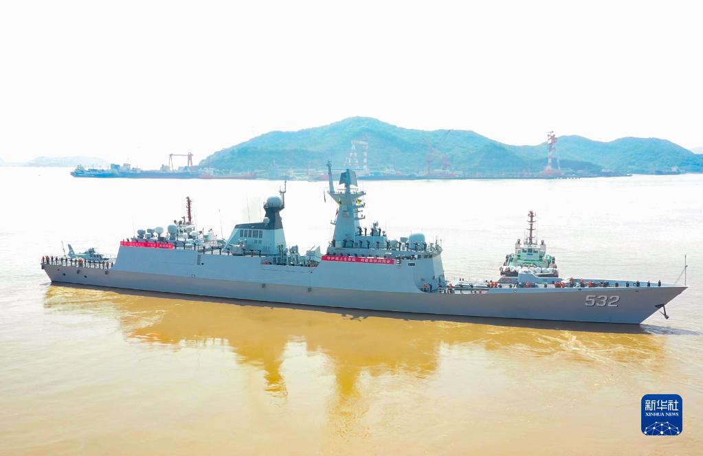 4月28日,中國海軍第44批護航編隊從浙江舟山某軍港解纜起航。這是編隊中的導彈護衛艦荊州艦(航拍視頻截圖)。