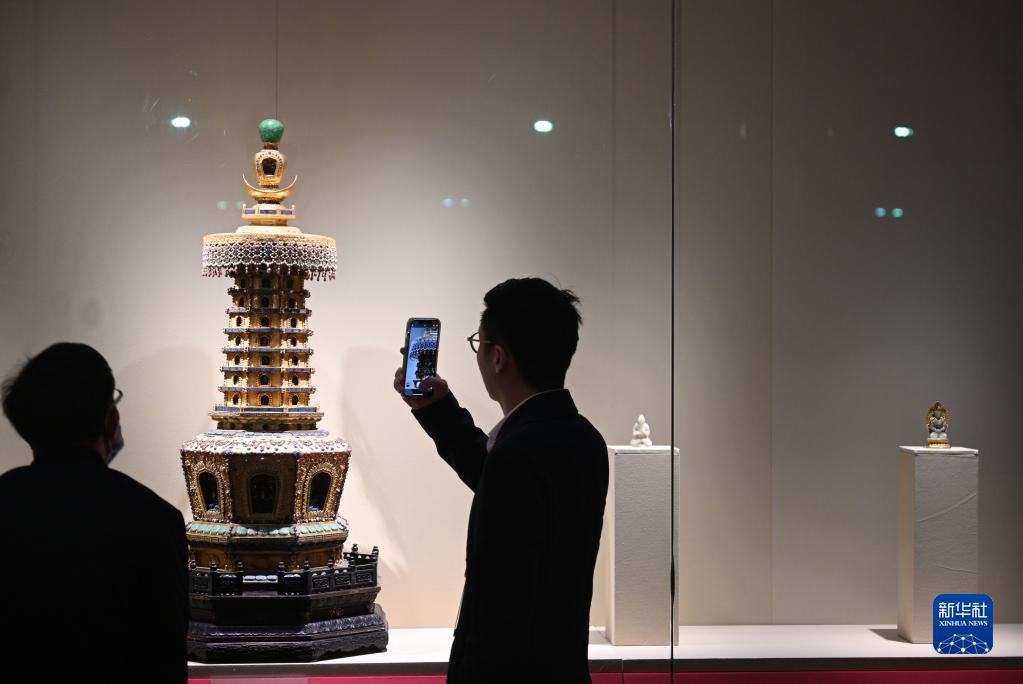 4月28日,嘉賓在北京故宮博物院參觀金嵌寶石八角佛塔。