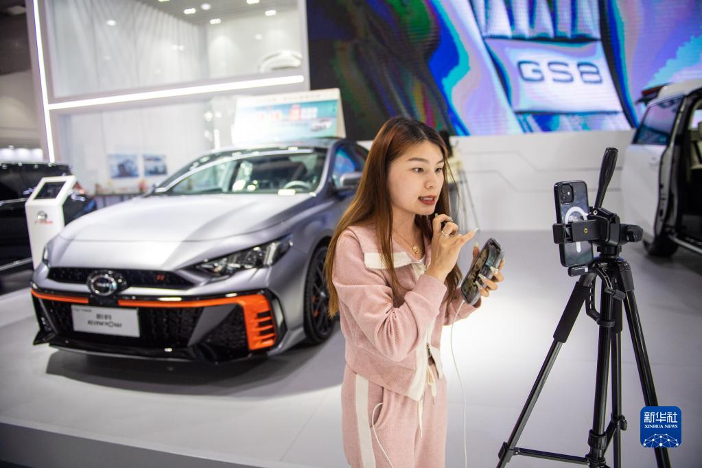 4月28日,一名主播通過(guò)直播介紹參展汽車。