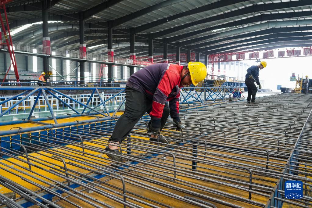 4月28日,工人在黃茅海跨海通道智慧梁場(chǎng)綁扎鋼筋。