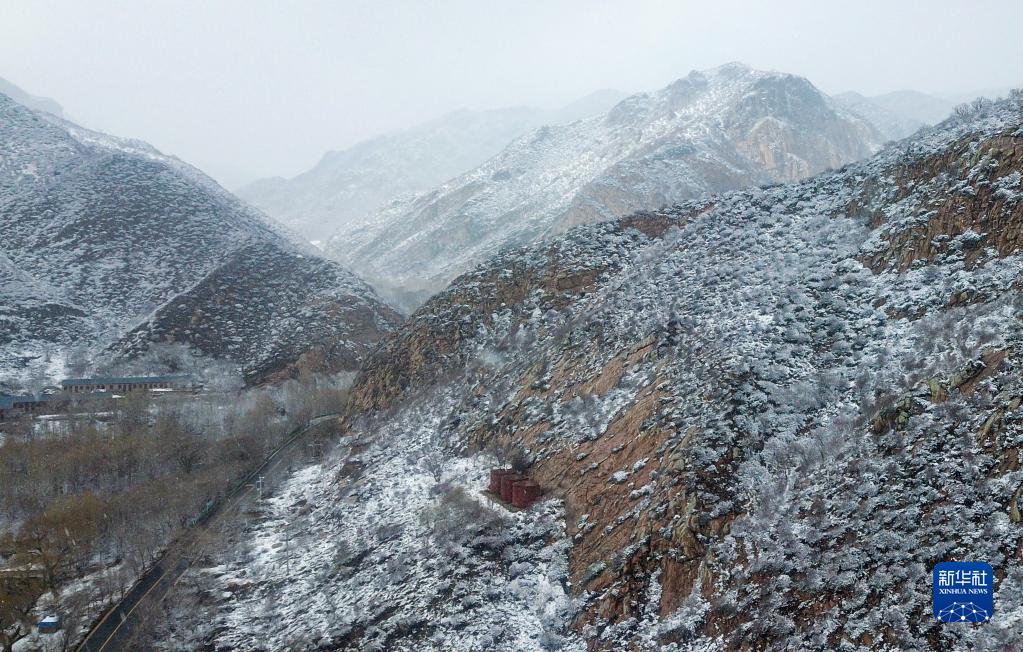4月28日拍攝的內蒙古自治區呼和浩特市北郊的大青山自然保護區雪景(無人機照片)。