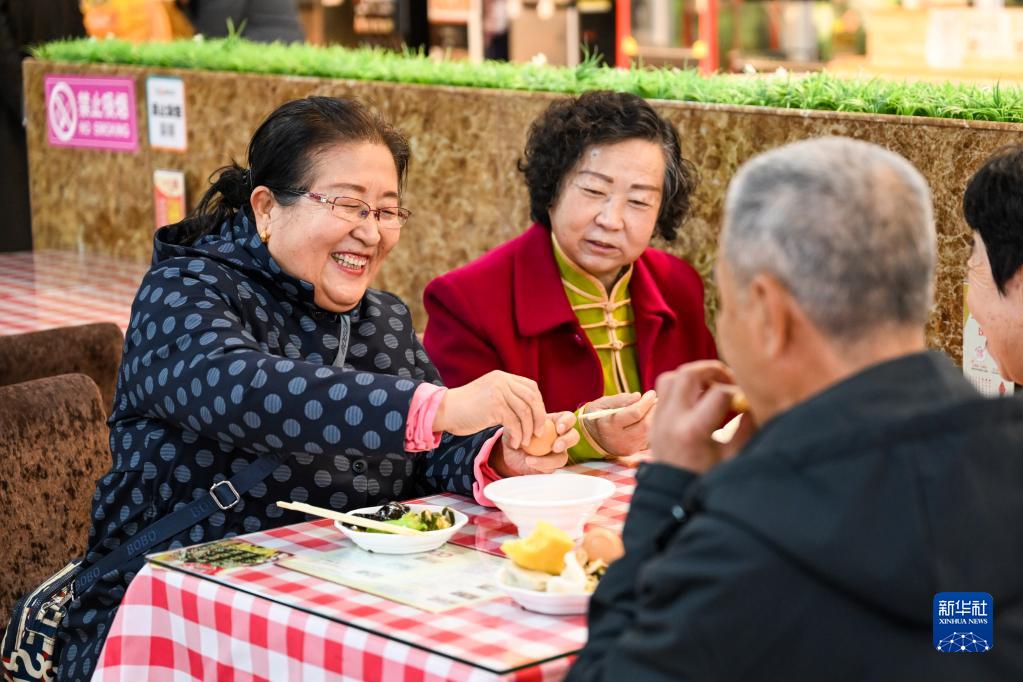 4月28日,老年人在伊金霍洛旗助餐點之一的福馨自助餐廳用餐。