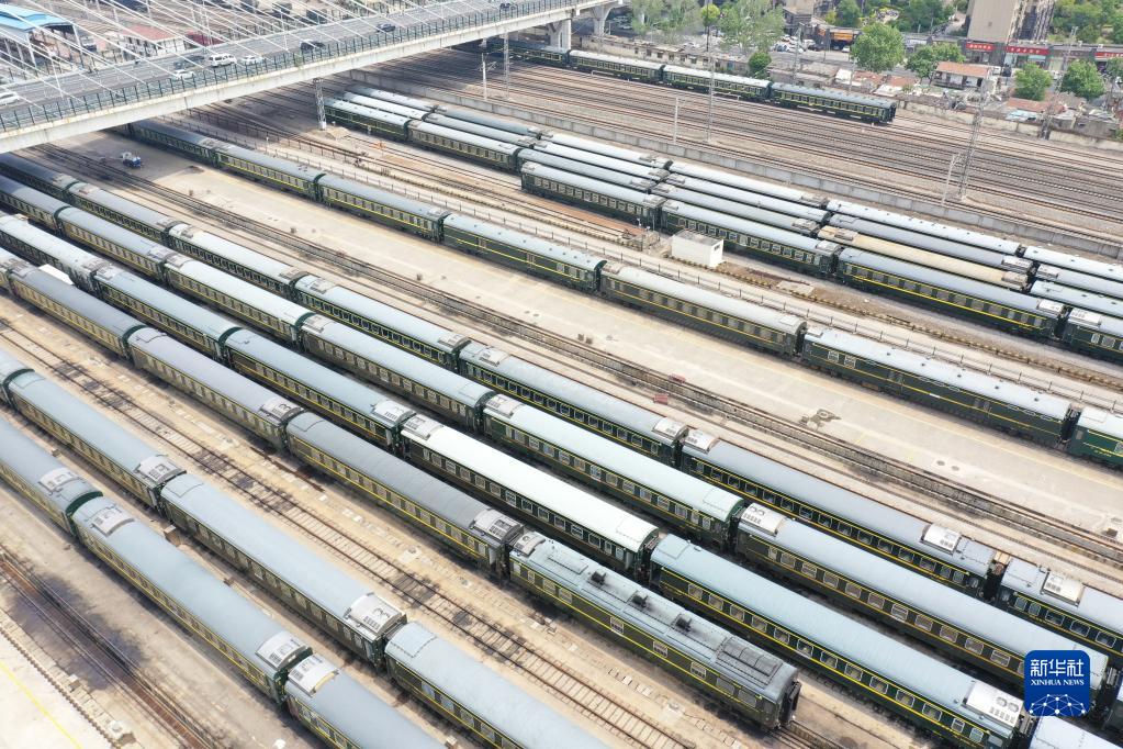 4月28日拍攝的中國鐵路上海局集團有限公司徐州站客車整備場內的臨時旅客列車(無人機照片)。