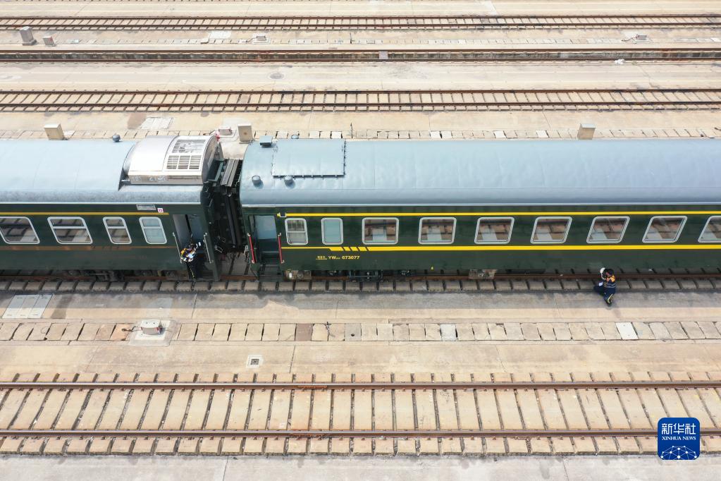 4月28日,中國鐵路上海局集團有限公司徐州站的鐵路連結員在對臨時旅客列車進行拉風作業(無人機照片)。