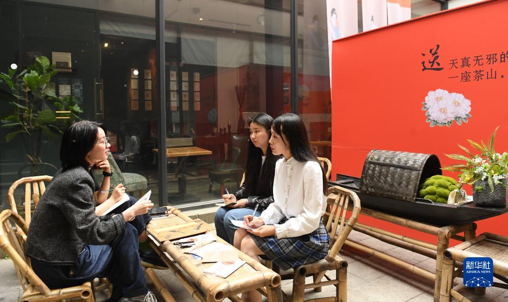 4月28日,浙江省湖州市吳興區(qū)愛山街道文化站的工作人員(右一、右二)與書店負(fù)責(zé)人商議“五一”期間讀書活動安排。