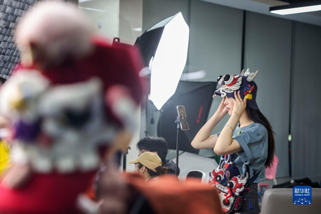 4月25日,直播團隊的成員在位于廣西桂林的工作室內通過互聯網展示文創產品。