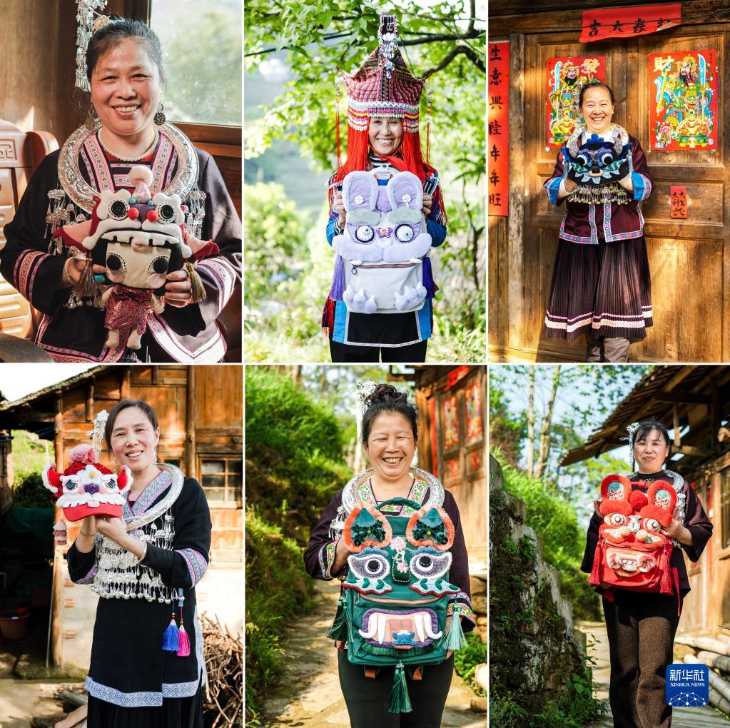4月26日,少數民族繡娘在廣西桂林市龍勝各族自治縣與自己縫制的產品合影。