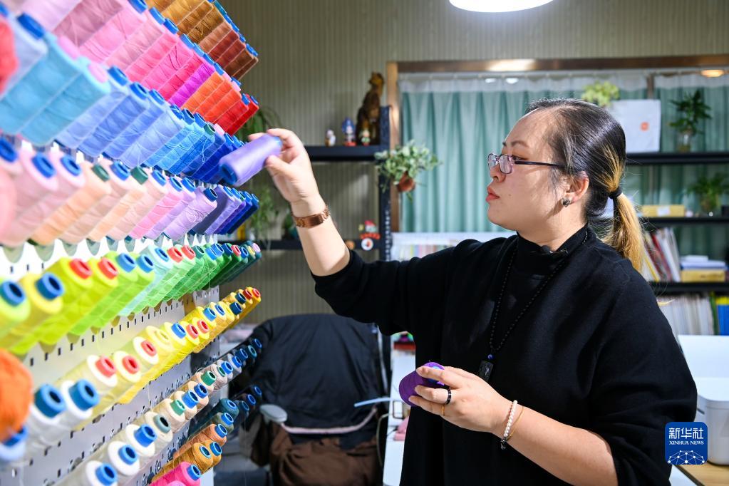 4月25日,劉思蔚在位于廣西桂林的工作室內(nèi)選擇創(chuàng)作用的針線。