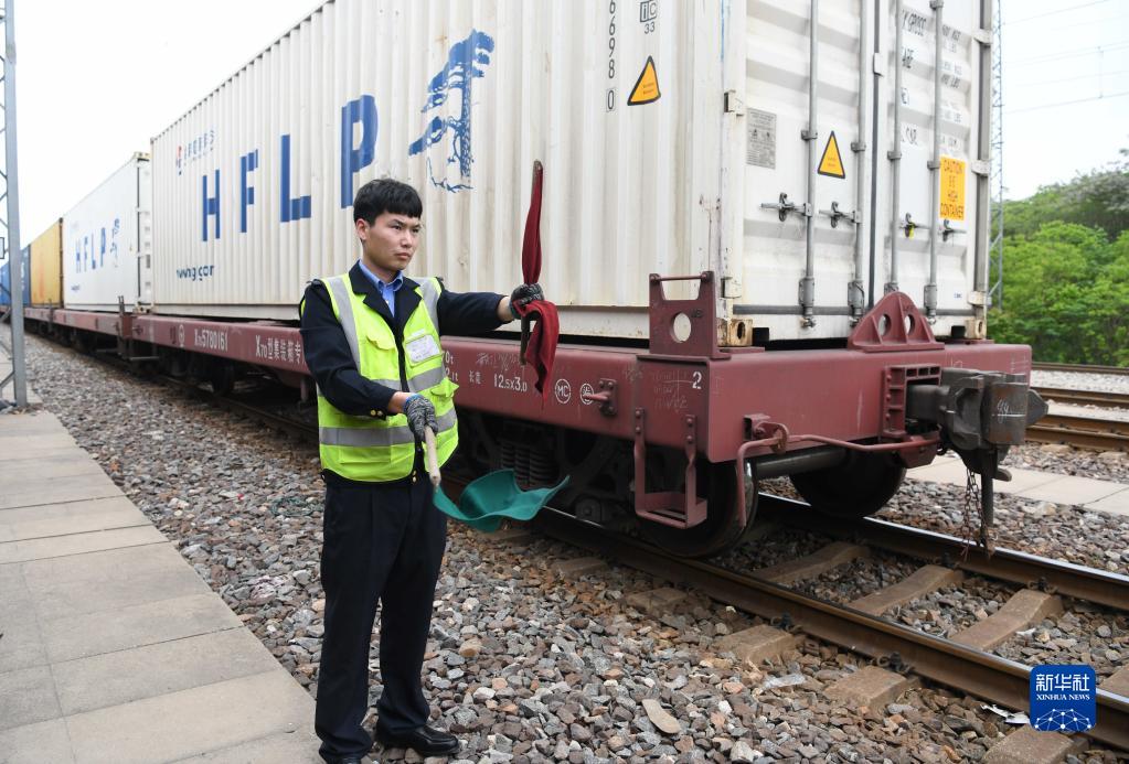 4月28日,副司機(jī)田錦波在合肥東站指揮機(jī)車與中歐班列列車對(duì)接。新華社記者 劉軍喜 攝