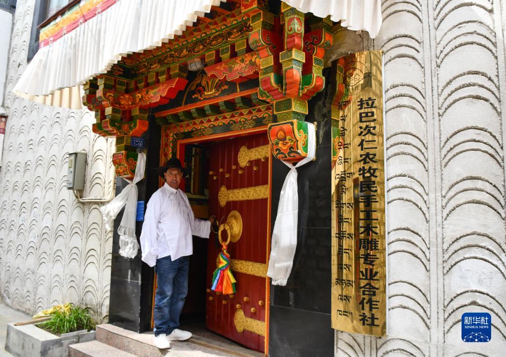 拉巴次仁在農(nóng)牧民手工木雕專業(yè)合作社門(mén)前(4月25日攝)。