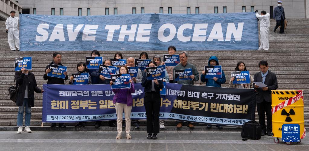 4月25日,在韓國首爾,民眾手舉標語抗議日本政府核污染水排海計劃。