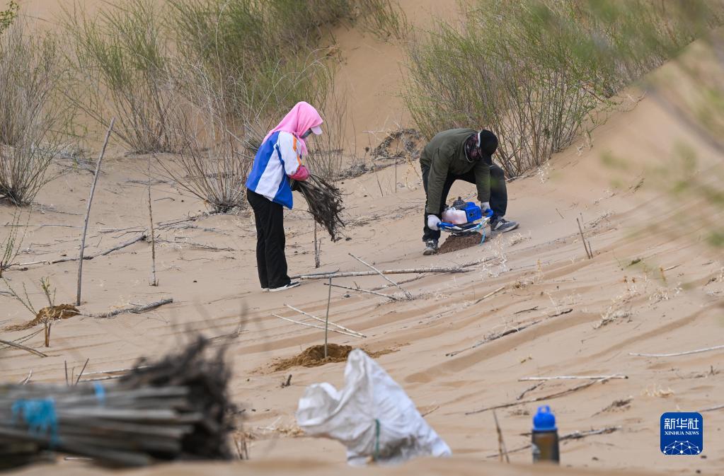 治沙客周斌祿(右)和妻子在內(nèi)蒙古庫布其沙漠億利生態(tài)治理區(qū)種植苗木(4月27日攝)。