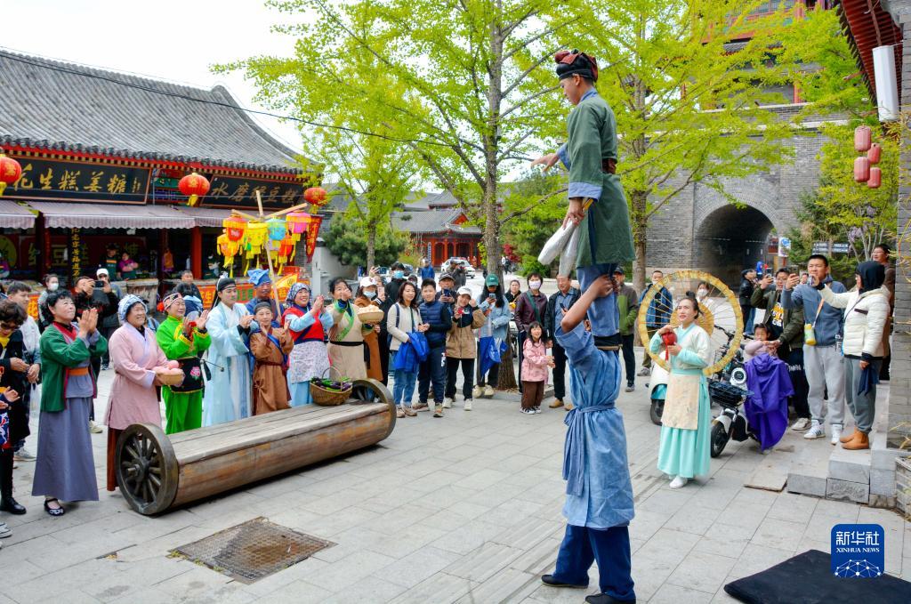 4月29日,游客在河北省秦皇島市山海關區古城觀看表演。