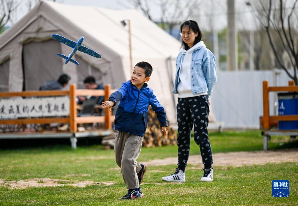 4月29日,在內蒙古呼和浩特市賽罕區的云羨露營營地,游人在草坪上玩耍。