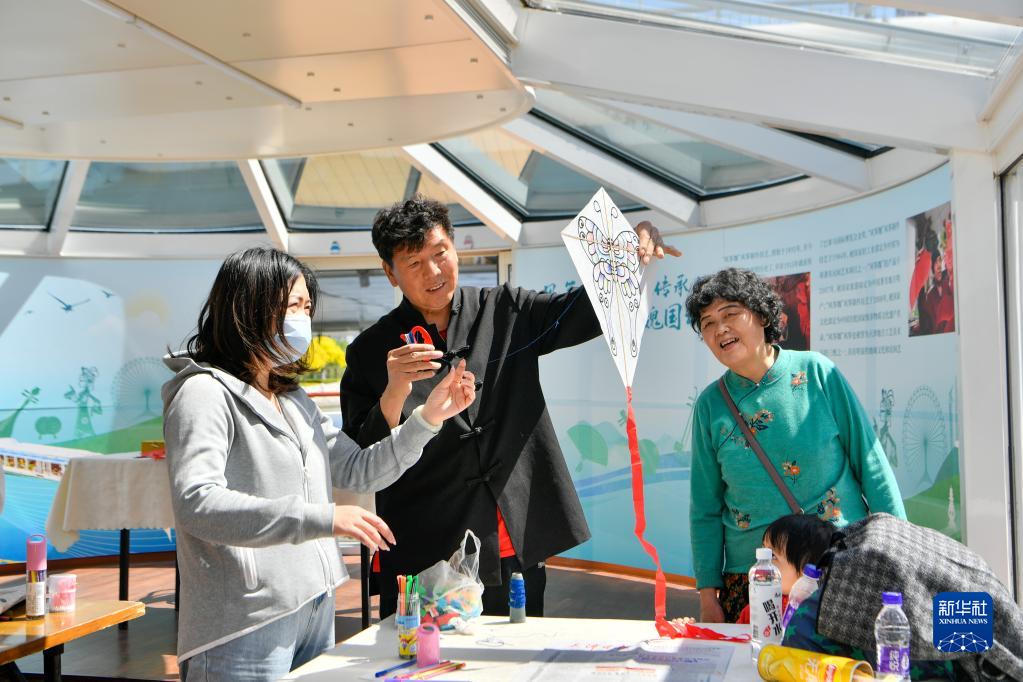 4月29日,國(guó)家級(jí)非遺項(xiàng)目“風(fēng)箏魏”傳承人魏國(guó)秋(左二)在天津海河游船上向游客介紹風(fēng)箏制作技藝。