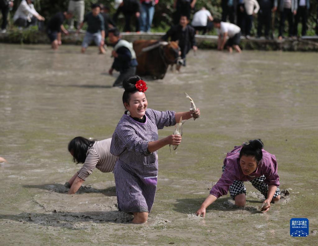 4月29日,在貴州省榕江縣兩汪鄉空申村,村民在趣味農耕活動中捉魚。
