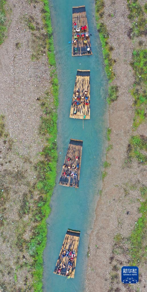 4月29日,游客在浙江省臺州市仙居縣永安溪體驗(yàn)生態(tài)竹筏漂流(無人機(jī)照片)。