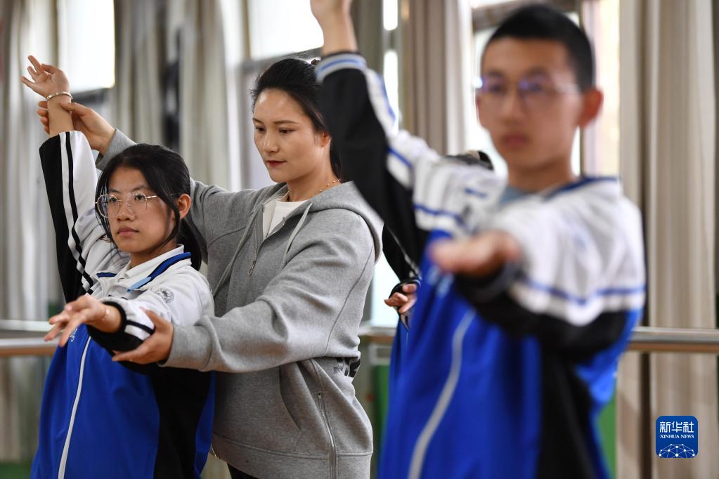 敦煌中學教師張夢婷(中)在舞蹈教室給學生糾正敦煌舞課間操的動作(4月26日攝)。