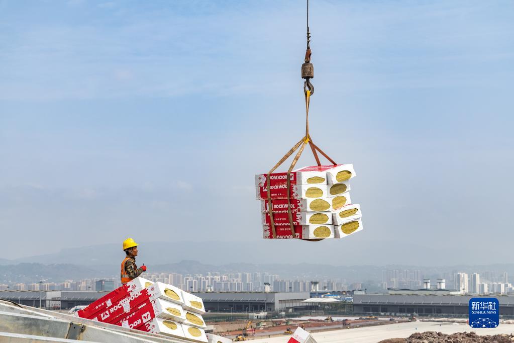 4月29日,工作人員在重慶江北國際機(jī)場T3B航站樓施工現(xiàn)場進(jìn)行屋面施工。