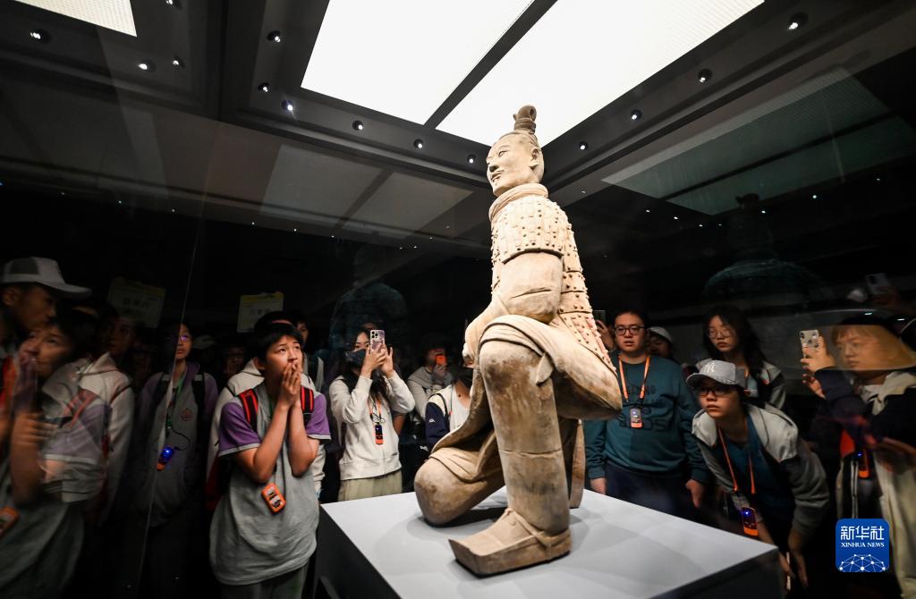 4月26日,游客在秦兵馬俑二號坑遺址內參觀跪射俑。
